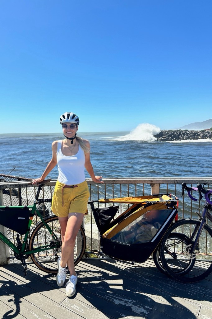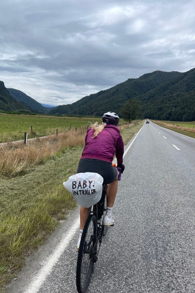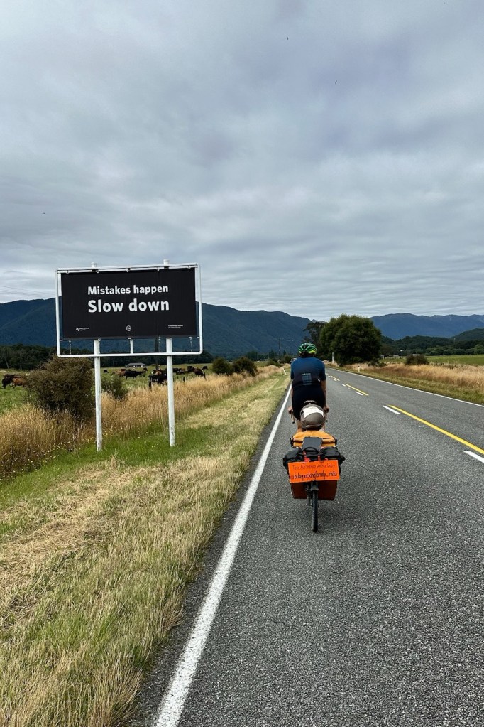 Kühl war es am Morgen, aber sonnig und ein weiterer Tag mit perfektem Radwetter bahnte sich an. Ein Tag fast vollständig auf dem Highway stand an, auf einem untergeordneten mit weniger Verkehr zwar, dennoch war uns dabei ein bisschen mulmig zumute. Zwar sind die allermeisten Autofahrer vorsichtig beim Überholen und es geht insgesamt deutlich entspannter zu als auf deutschen Straßen, aber immer wieder gibt es doch welche, die den Abstand nicht einschätzen können, vor allem, wenn ihrem Fahrzeug noch ein breiter Wohnwagen folgt. Radfahrer im Straßenverkehr sind hier kein häufiger Anblick und Kinderanhänger kennt man so gut wie nicht – aus einigen Gesprächen wissen wir, dass die meisten Leute Gepäck, einen Hund oder alles Mögliche in dem Anhänger vermuten, und obwohl schon seit Längerem ein Schild an seiner Rückseite darauf hinweist, wurden wir auch schon gefragt, wo denn das Baby sei. Um es also noch klarer zu machen, war mit einer weißen Plastiktüte und einem Filzstift schnell noch ein Schild improvisiert, das nun hinten an Mandys Satteltasche die Autofahrer darauf hinweist.