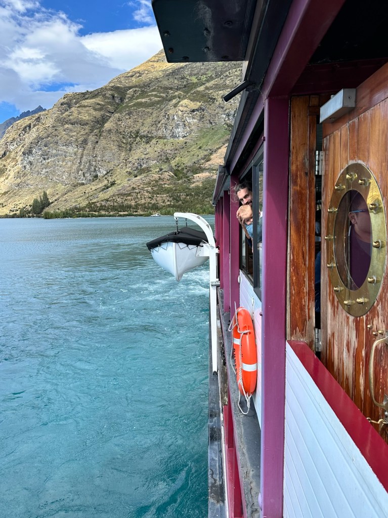 Der absolute Kontrast zum vollen und hektischen Queenstown erwartete uns am nächsten Tag. Mit einem historischen Dampfschiff haben wir übergesetzt zum Westufer des Sees, an dem es außer zweier großer Farmen nichts gibt. Also nichts. Der nächste Ort liegt 100 Kilometer weiter hinter der nächsten Bergkette, 80 davon sind nur mit Allradantrieb gut befahrbar. Oder halt mit dem Fahrrad.