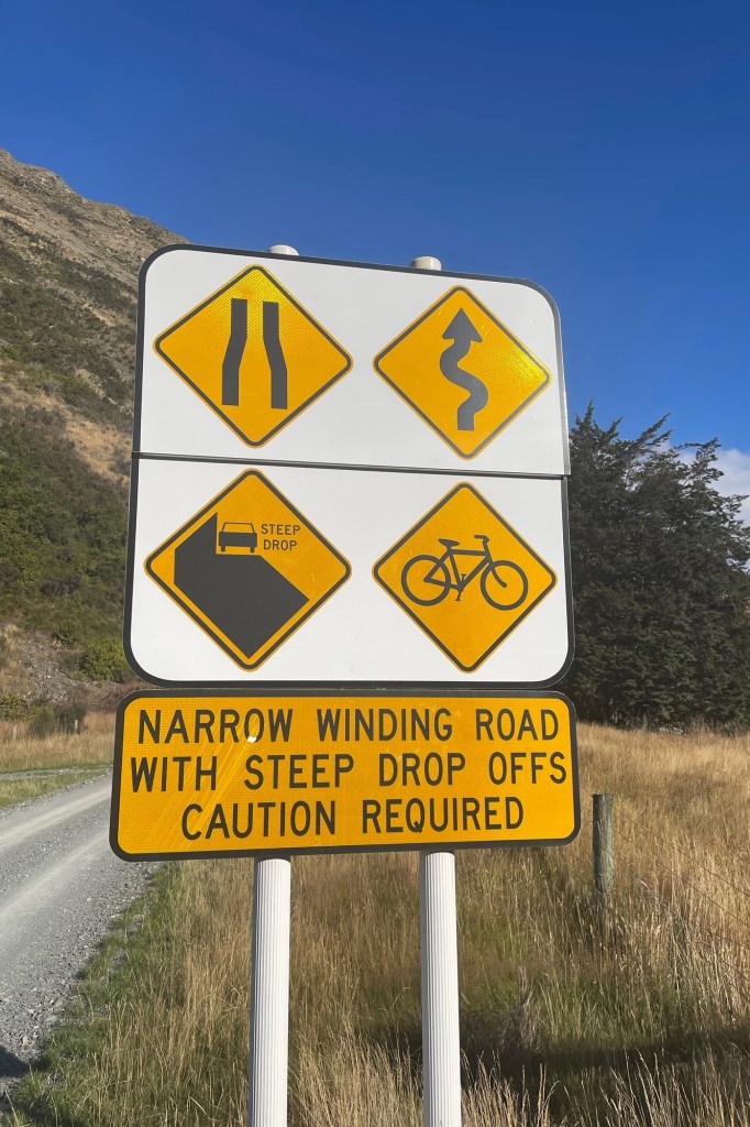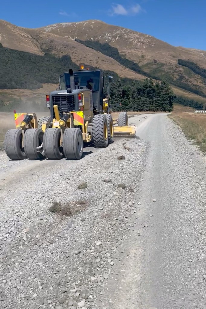 Das Schlimmste, was dir auf einer Schotterstraße begegnen kann. Radfahrer warnen einander, man darf seinen Namen nicht nennen, und wer es doch tut, wird ihm bald begegnen und es bitter bezahlen – DER GRADER! Diese Höllenmaschine erneuert den Straßenbelag, pflügt ihn auf und verteilt ihn neu, und überall, wo er gewesen ist, leiden Radfahrer. Aus fest eingefahrener Oberfläche wurde tiefer loser Schotter, Lenken ist kaum noch möglich, man muss sich irgendwie in den Spurillen der Fahrzeuge halten und man fragt sich, wie in aller Welt das jetzt die Straße verbessert hat.