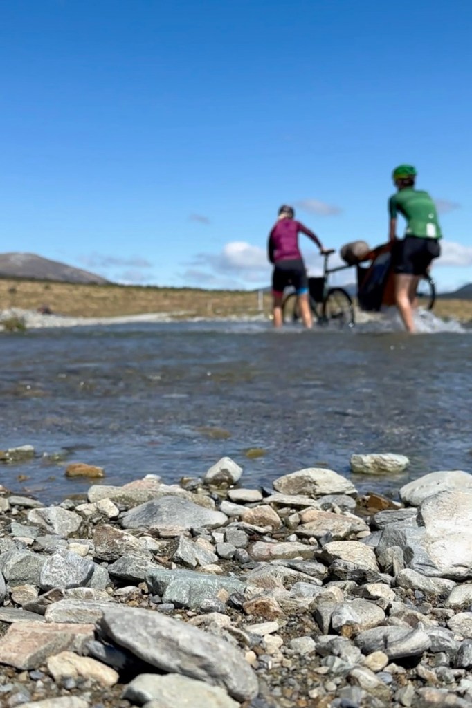 In dieser Nacht war Karl der Einzige, der nicht gefroren hat, kuschelig in zwei Schlafsäcke eingehüllt hat er seelig geschlafen. Auch am Morgen war es noch kalt, bis es die Sonne endlich über die Bergkämme schaffte und es schlagartig warm wurde. Der angekündigte Berg begrüßte uns am Morgen erstmal mit 16 % Steigung auf Schotter. Im Wissen, dass dies der allerletzte Berg auf dieser Reise ist, waren wir aber schnell oben. Ab dann führte uns die Straße ewig durch die Einsamkeit. Zweimal galt es, einen Fluss zu furten, beim zweiten Mal war dieser zu tief, um den Trailer zu ziehen, wir mussten ihn mitsamt dem Passagier rübertragen, mit den Füßen im eisigen Wasser. Es ging immer leicht bergab und der steife Wind wehte von hinten, die Straße zwar geschottert, aber so gut eingefahren, dass man eine fast glatte Fahrbahn unter den Reifen hatte. Es ging also mit Leichtigkeit schnell voran … bis wir IHM begegneten.