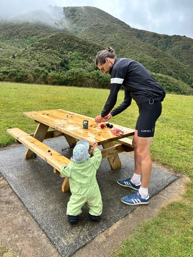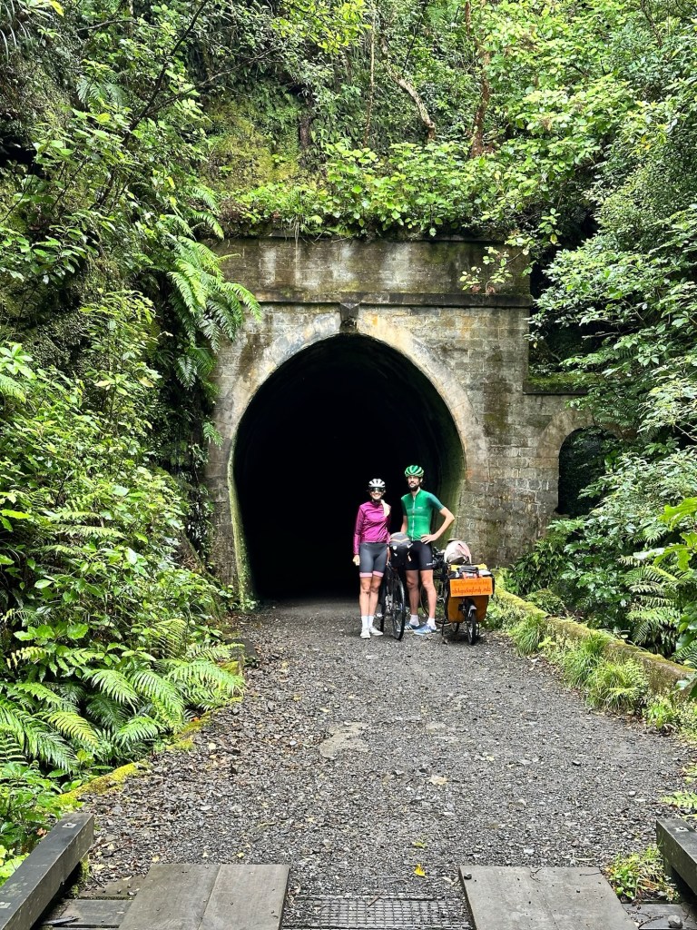 Oben: Nach 7 Kilometern Steigung war der höchste Punkt und Meilenstein #14 erreicht: der Remutaka Summit Tunnel. Drüben gab es erstmal die Mittagspause, leider dann im Regen.