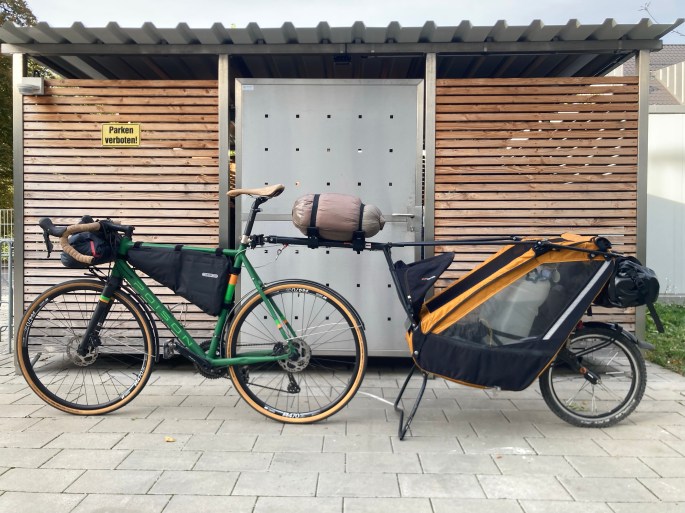 Bei neu angeschaffter Ausrüstung haben wir versucht, möglichst konsequent auf geringes Gewicht zu achten. Alles zusammen genommen kommen trotzdem – zusätzlich zum Gewicht der Räder – ungefähr 29 kg Gepäck zusammen, die auf zwei Fahrräder und den Anhänger verteilt werden müssen. Dazu kommen Wasser, Proviant für zwei Tage und natürlich der Passagier im Singetrailer, der trotz seines zarten Alters schon ein stattliches Gewicht von fast 12 kg erreicht hat.