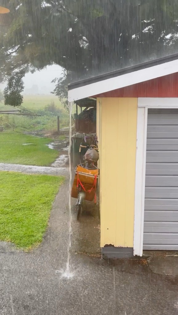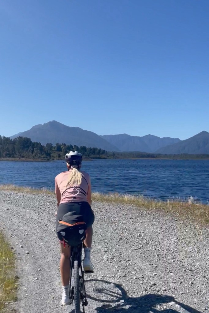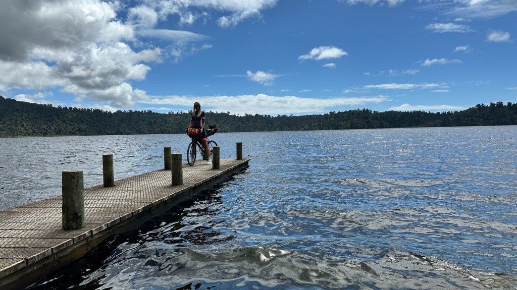 Die Wettervorhersage kündigte leider einige nasse Tage und einen Tag mit ganz besonders scheußlichen Bedingungen an. Bei der stündlichen Niederschlagsmenge leuchteten jede Menge zweistellige Zahlen auf. Daher beschlossen wir, vor besagtem Tag möglichst weit zu kommen und ihn dann unter einem festen Dach auszusitzen. Die lange Etappe führte uns also nach Harihari, wo es ein Pub und ein winziges, ins lokale Café integriertes Geschäft gibt sowie rechts und links des Highways jeweils zehn Häuser. Immerhin gab es im Laden Windeln, sonst wären wir am Ruhetag absolut aufgeschmissen gewesen. Auf dem Weg nach Harihari lag noch Meilenstein #22, am Ufer von Lake Ianthe lachte uns noch die Sonne zu. Der Pausentag wäre nicht unbedingt zum Ausruhen notwendig gewesen, aber ein Blick aus dem Fenster machte sofort klar, dass er absolut unverzichtbar war, denn niemand würde freiwillig in diesem Wetter Rad fahren.