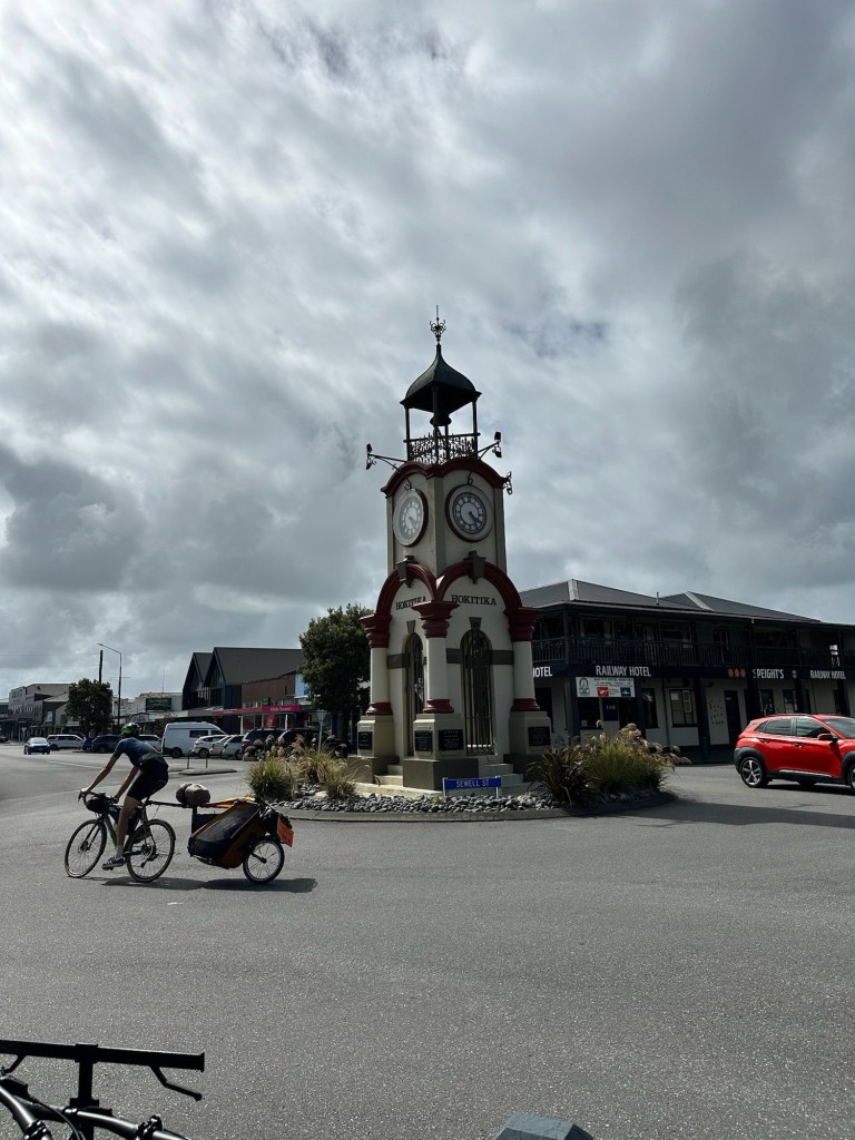 Nur wenige Kilometer am Ende des Tages hatten wir nochmal eine asphaltierte Straße unter den Reifen, bis wir Hokitika erreichten, die letzte richtige Stadt an der Westküste, bevor wir diese gut dreihundert Kilometer weiter südlich über die Berge wieder verlassen werden. Unser Meilensteinfoto #21 fotografierten wir im Vorbeifahren. Der Glockenturm wurde irgendwann als Denkmal für die Freiwilligen in irgendeinem Krieg und für irgendeine Königskrönung erbaut.
