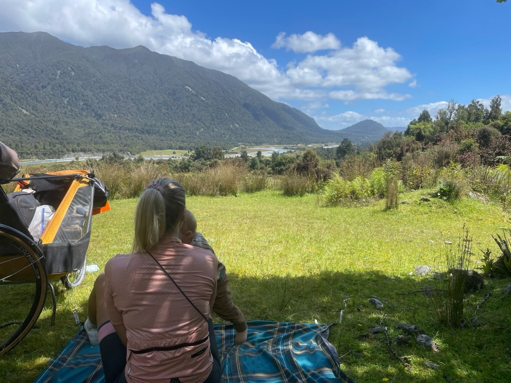 Mittagspause: Ein schattiges Plätzchen mit traumhafter Aussicht. Hier gibt es keine anderen Menschen. Zeit zum Ausruhen und Spielen. Danach ging es erfrischt weiter am Fluss hinab bis nach Hokitika am Strand.