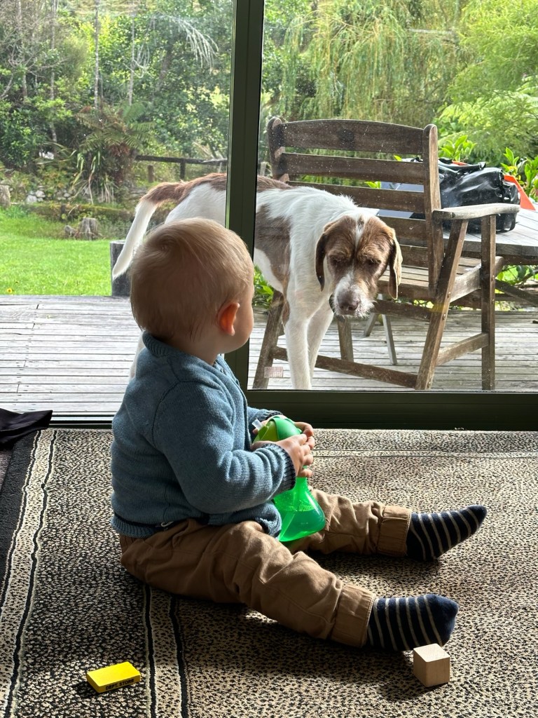 Der Tag war also nach gerade mal 20 Kilometern schon wieder vorbei, das aufwendige Packen und Verstauen hat sich dafür kaum gelohnt. Unterwegs haben wir uns eher gefragt, wo denn die Wildnis bleibt. Eben und schnurgerade meist durch den Wald war der Weg eher E-Bike-freundlich. Dafür konnten wir schon mittags in der etwas hippiehaften Backpackerunterkunft einchecken, Karl ausgiebig im Gras krabbeln und spielen und neue Freunde machen lassen. Etwas unverhofft fanden wir uns am Abend als Babysitter für die sechsjährige Tochter anderer Gäste wieder, während ihre Eltern beim Atem-Workshop waren. Eigentlich hatte sie mit Karl spielen wollen, änderte aber schnell ihre Meinung und wollte lieber mit uns spielen